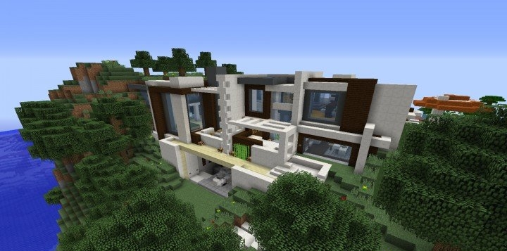 Один из лучших механических домов для майнкрафт, которых я видел. Помимо того что дом механический, он ещё и в стиле Modern. На входе вас будут ожидать механические двери с системой защиты от нежелательных гостей и монстров. Суть защищённого входа в том, что пока вы не откроете дверь изнутри, игрок который будет нажимать на кнопку снаружи будет попадать в ловушку, которая его убьёт насмерть. Дом имеет несколько этажей, а также большое подземелье с хранилищем и припаркованным кораблём. |